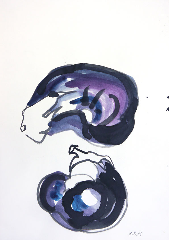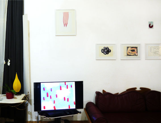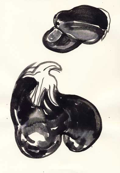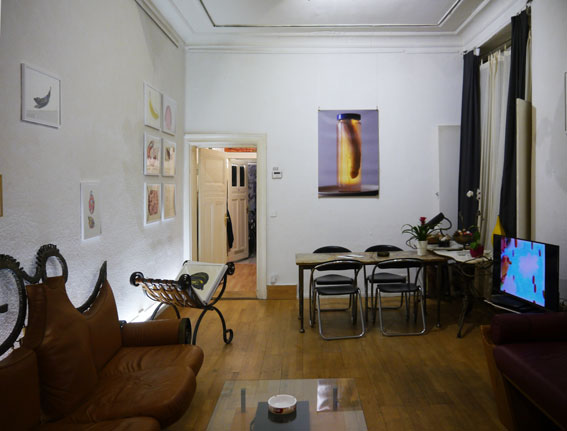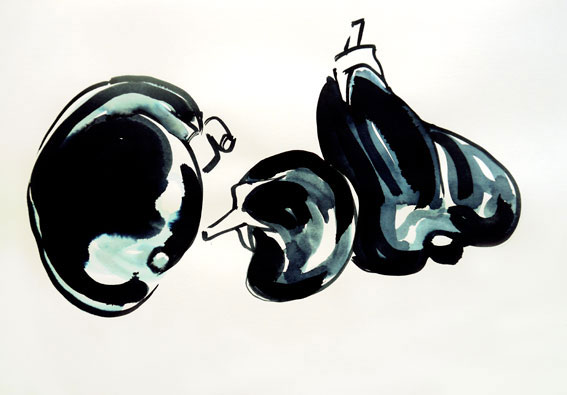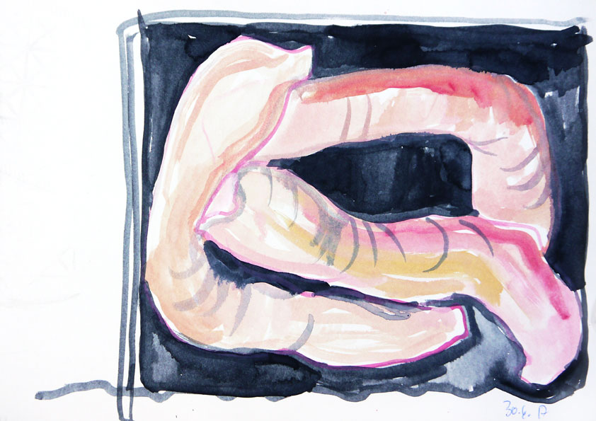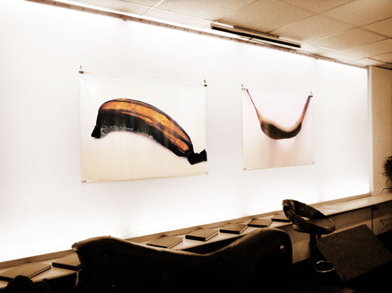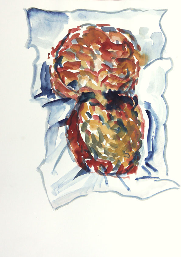 Christine Kriegerowski experimentiert mit Verpackungen. Bananen zieht sie Netzstrumpfhosen an, was typischerweise als erotisierend gilt, funktioniert das auch bei der Deutschen liebstem Obst? Werden die bestrumpften Lebensmittel zu Chiffren für den weiblichen Körper oder zu Punks – Ausgerechnet Bananen? Sie knüpft eine Aufhängungsvorrichtung aus Makramée für Zucchini und dokumentiert zeichnerisch und fotografisch.