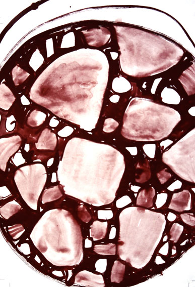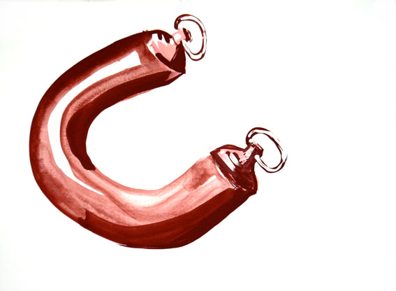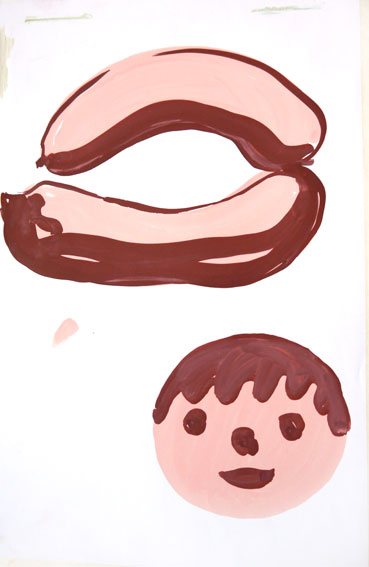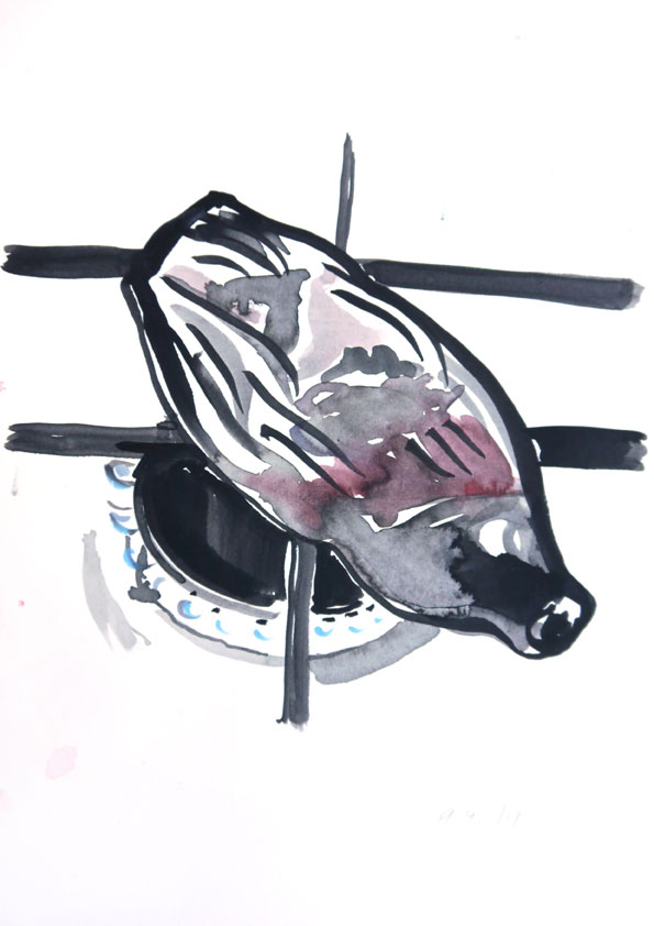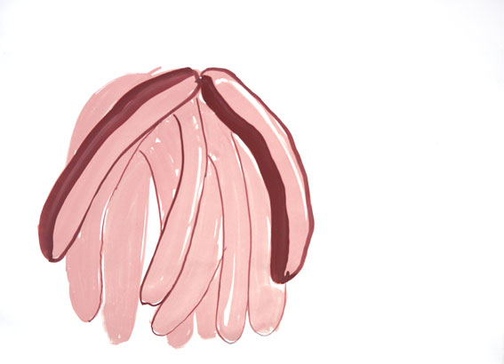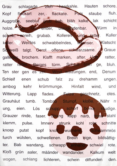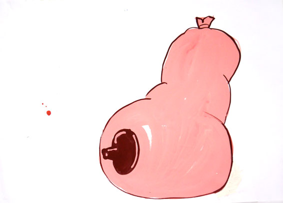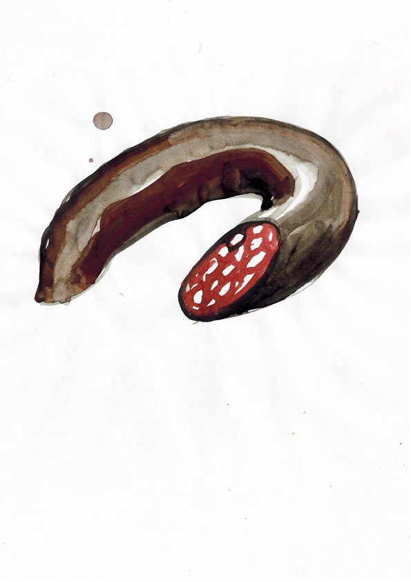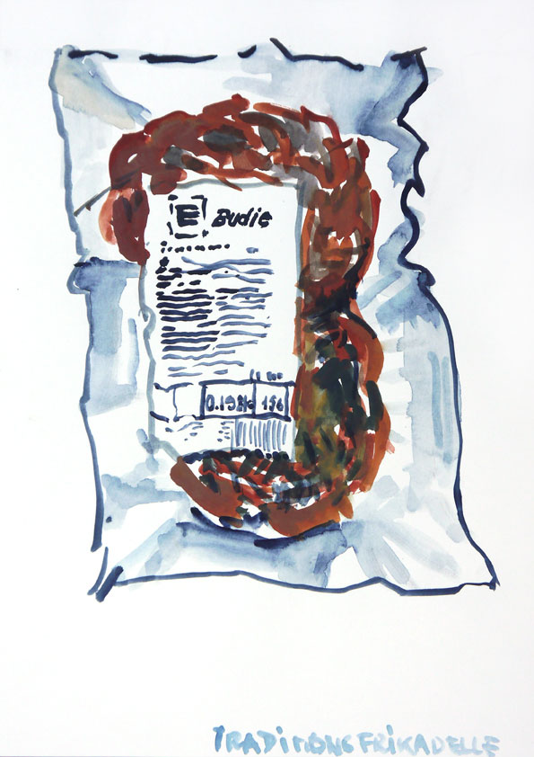 Die Arbeiten mit Fleisch und Wurst sind älter, von 1996, sie gehen auf ein gemeinsames Projekt mit dem Autor Ulrich Schlotmann zurück, „die Häute und ihr Metall“. Kriegerowski illustrierte die geschlachtete Prosa mit ihren Impressionen von Wurst. Neben ganzseitigen Schnitten durch Zungenwurst, Grillschnecken und Würstchenhaufen entwickelte sie Wursthybride. Statt des Zipfels haben die eine Brustwarze – wo die Wurst doch männlich konnotiert ist. Eine hat sogar zwei Brustwarzen mit Piercings.